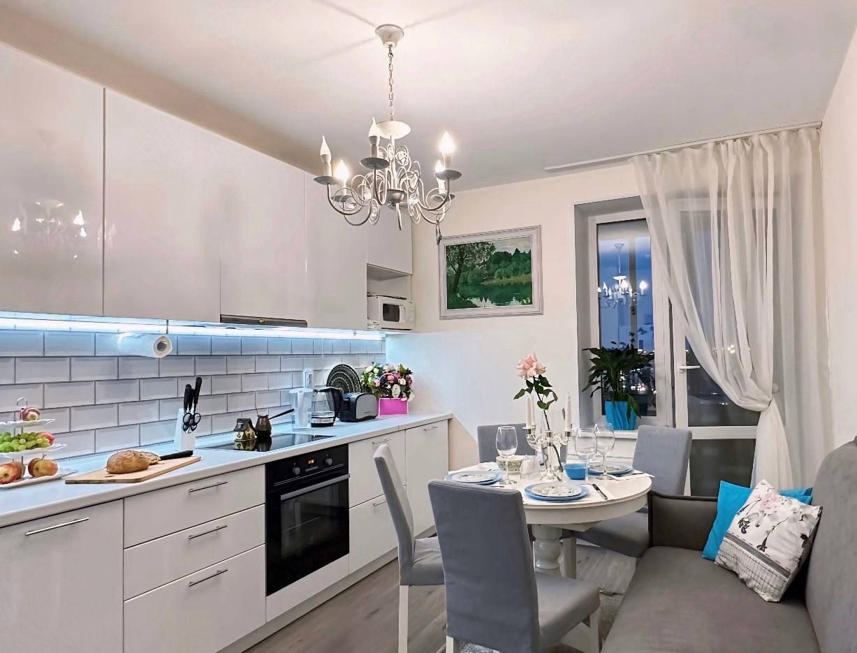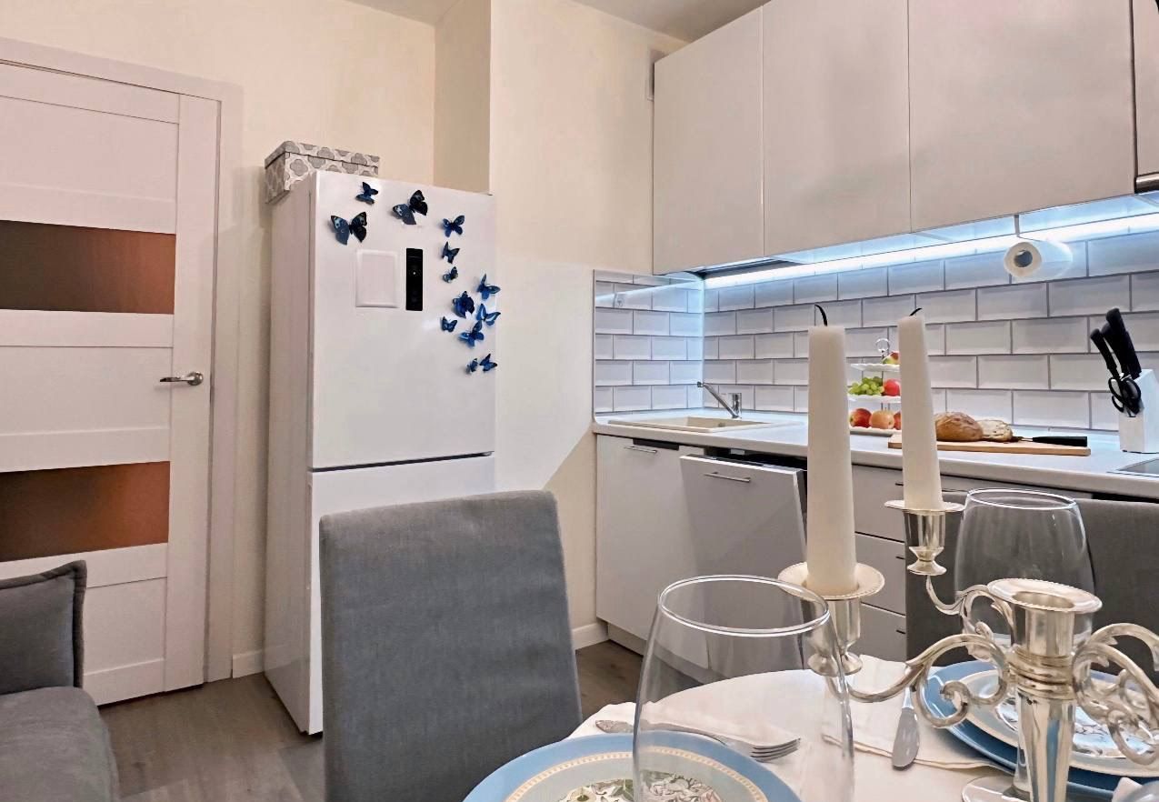 Кухня со всем необходимым (посудомоечная машина, холодильник, электрическая варочная панель(безопасна для людей с кардиостимуляторами), микроволновая печь, чайник, а так же красивая посуда, приборы и фильтр для питьевой воды)