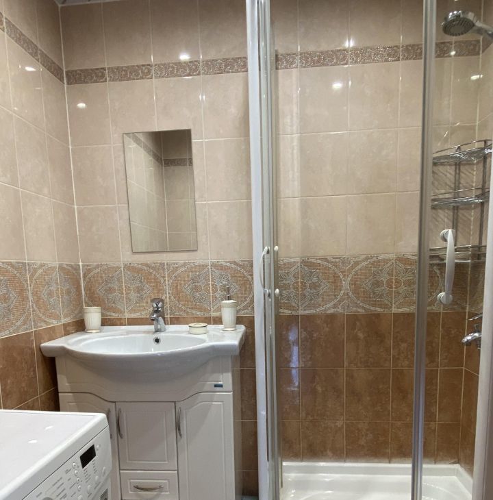 — Современная ванная комната с душевой кабиной и стиральной машиной