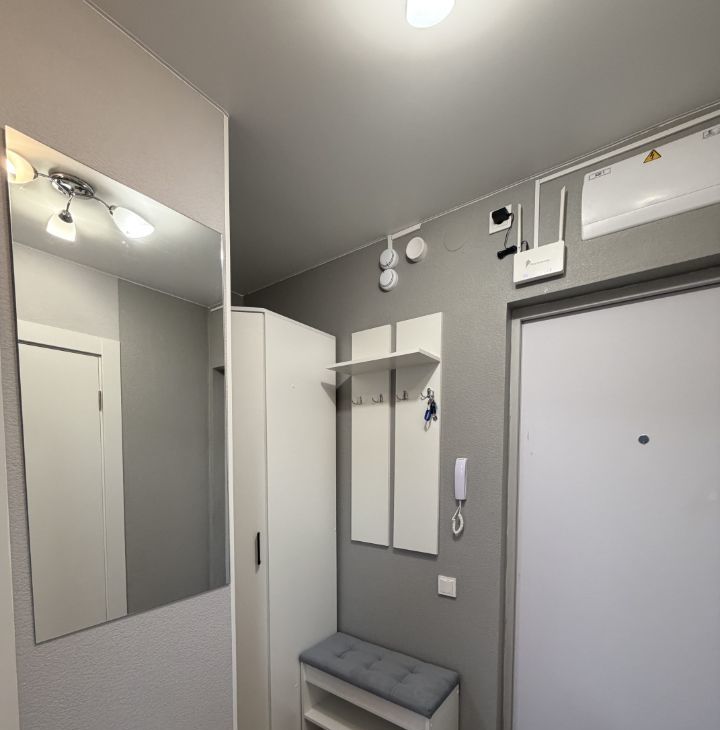 Санузел совмещенный, оборудован современной сантехникой и стиральной машиной. В прихожей предусмотрены удобные шкафы и вешалка для хранения вещей.