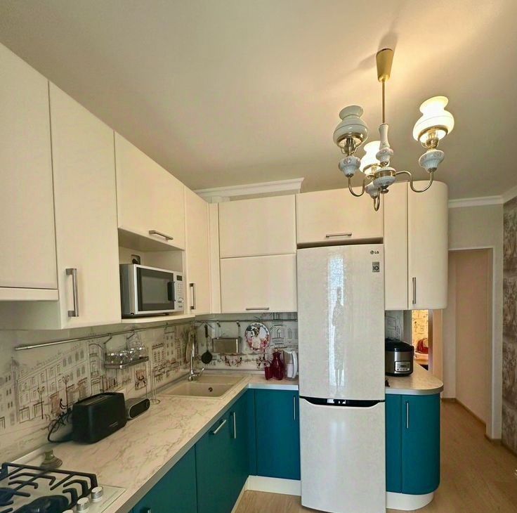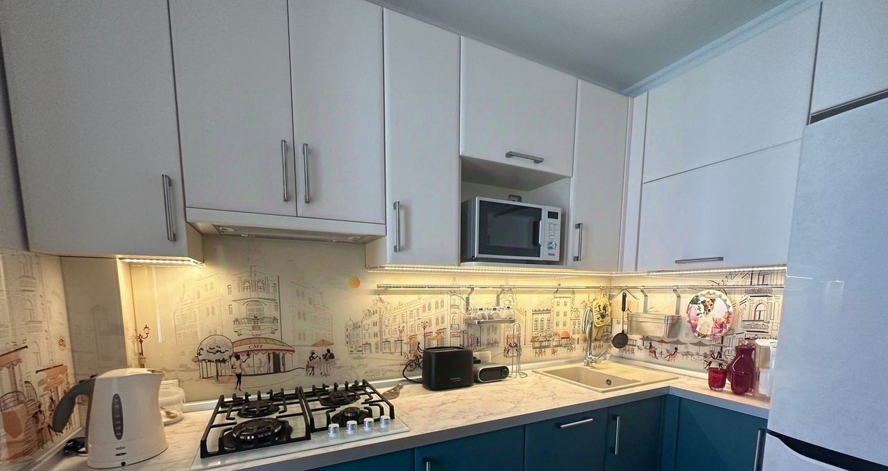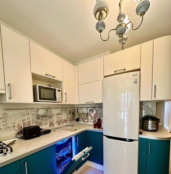 Комфортная кухня обустроена всей необходимой мебелью и бытовой техникой: посудомоечная машина, варочная панель, печь Свч, большой холодильник, тостер, чайник, мультиварка.