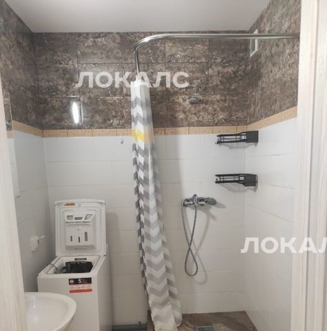 Ванная комната: Душевая, туалет, стиральная машинка, раковина, настенный шкаф с зеркалом,