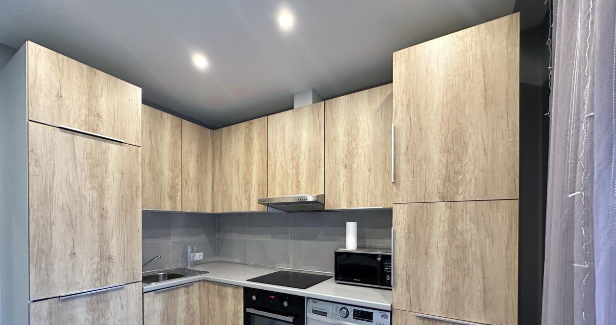 Просторная кухня со всей необходимой мебелью и техникой - варочная поверхность и духовой шкаф, посудомойка, микроволновка, чайник, стиральная машина.
