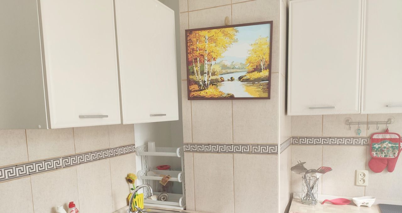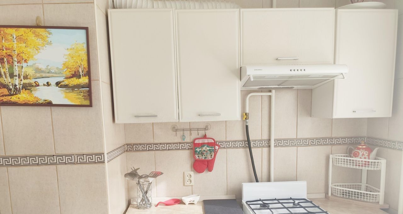 Кухня компактная, но функциональная, оснащена газовой плитой и холодильником. Ванная комната раздельная, установлена стиральная машина.