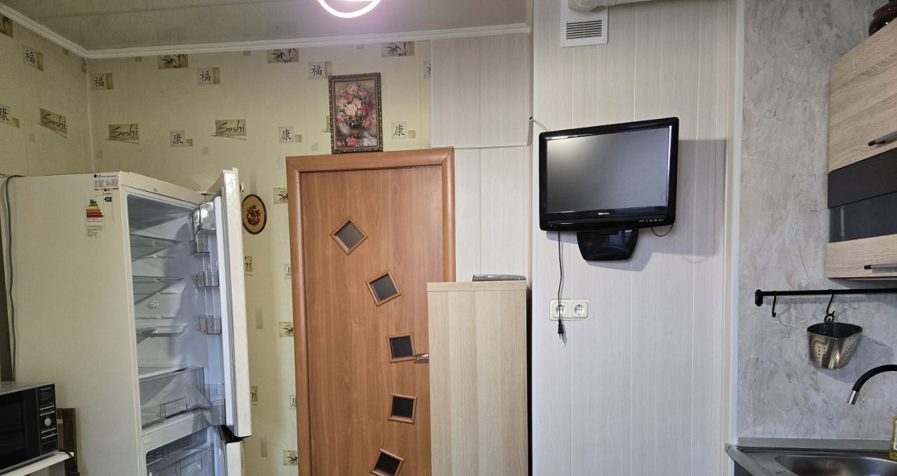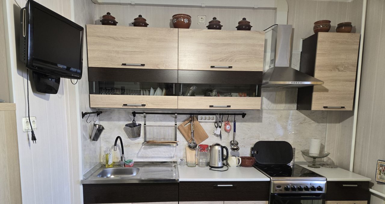 Кухня 10м квадратная, с новой кухонной мебелью. Есть все необходимое - большой холодильник, чайник, микроволновка, мультиварка, посуда, гостевой диван, ТВ, обеденный стол со стульями.