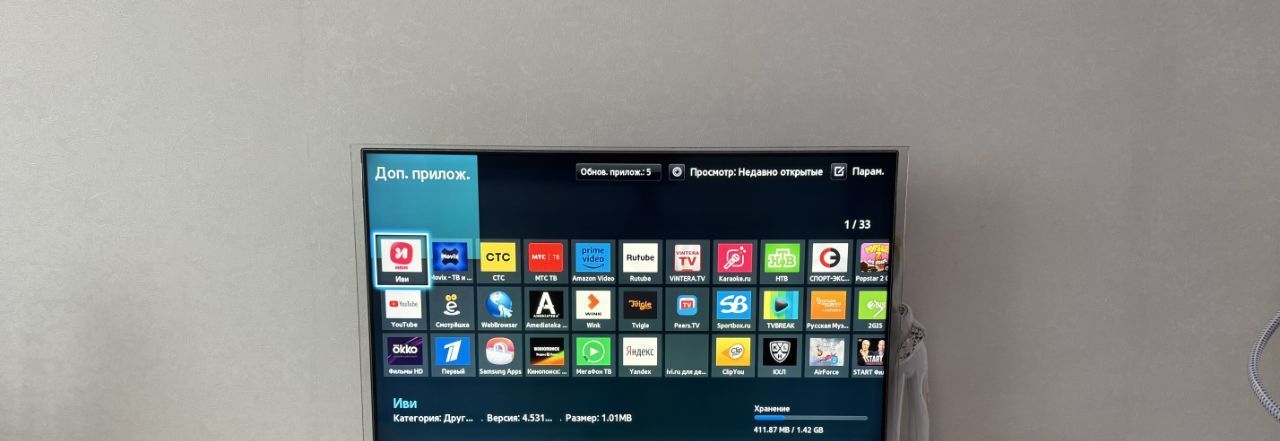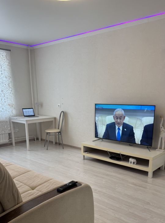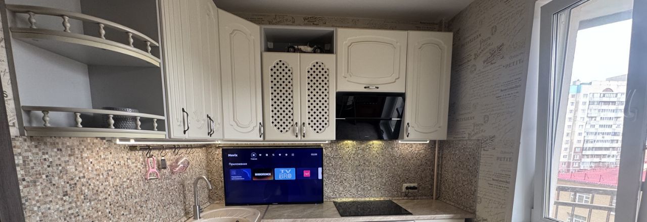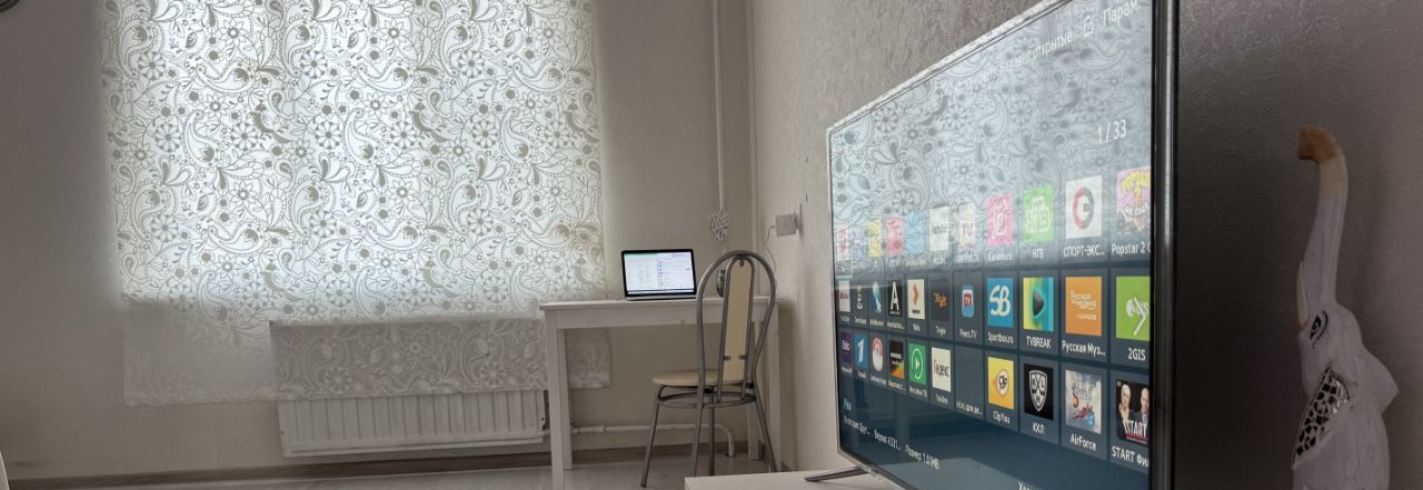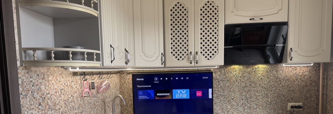 •На кухне большой смарт тв QLED 43 диагональ.