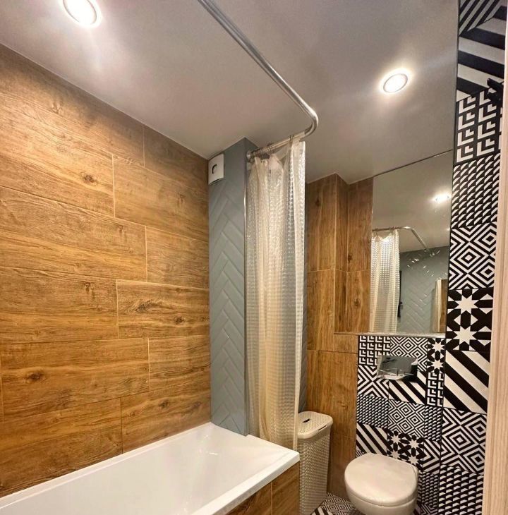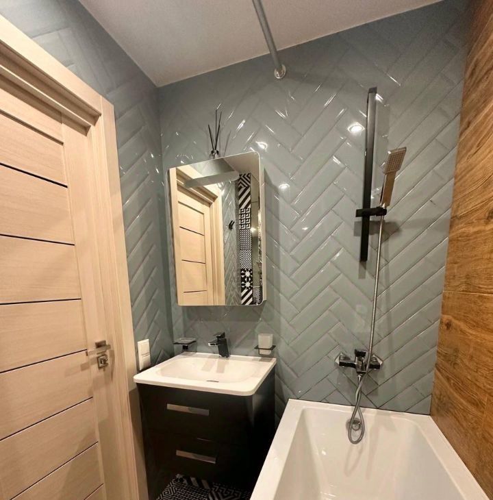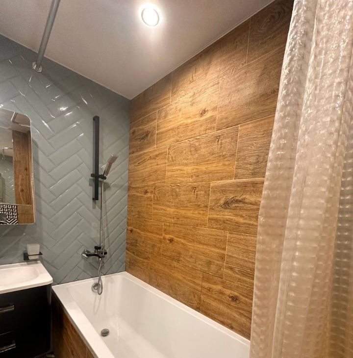 Предусмотрена просторная ванная комната с акцентной ванной и тропическим душем. Подключен полотенцесушитель.
