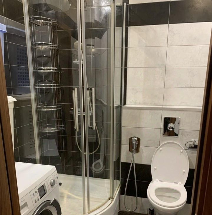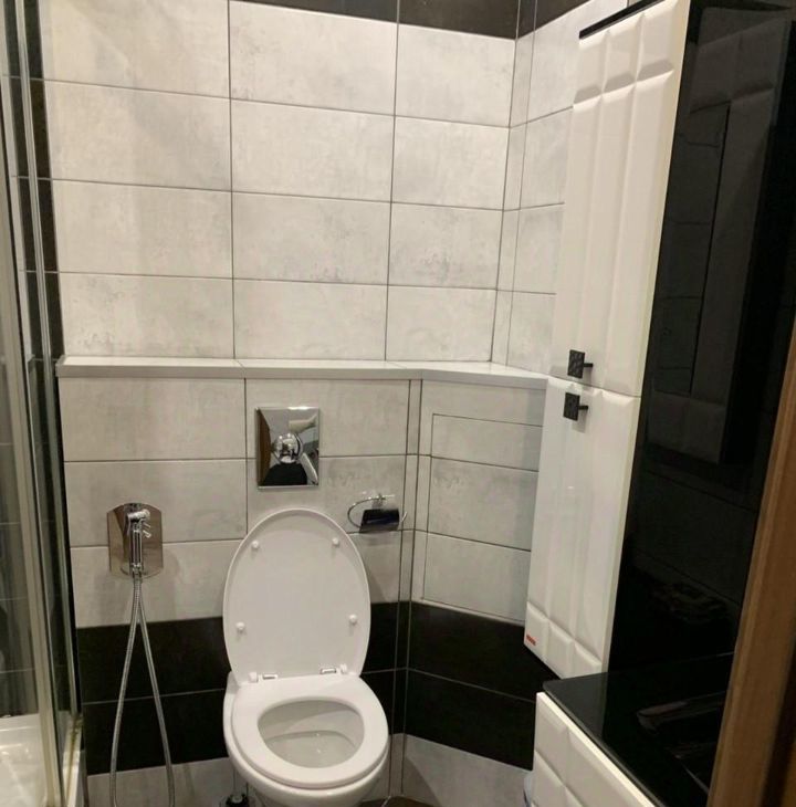 В ванне душевая кабина, подвесной унитаз, гигиенический душ, полотенцесушитель электрический, раковина с зеркалом и мебелью