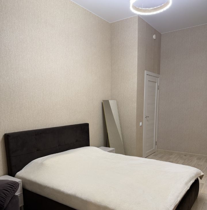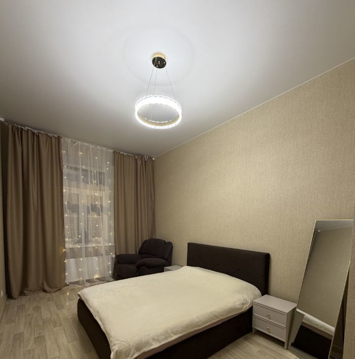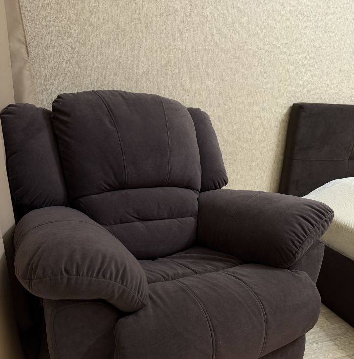 В спальне кровать с подьемным механизмом , что добавляет место хранения вещей, мягкая спинка кровати делает кровать максимально комфортной, а также в спальне стоит дорогое кресло - релакс с выдвижным механизмом и переносное зеркало во весь рост