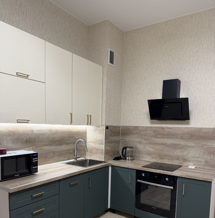 Кухня оборудована всей необходимой техникой: холодильник, варочная панель, духовой шкаф , посудомоечная машина , микроволновая печь, а также телевизор и удобный диван!