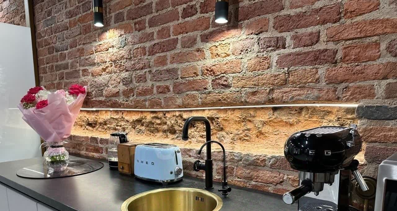 Элегантный комплект техники итальянского бренда Smeg: кофемашина, микроволновая печь, холодильник и посудомоечная машина. Дополняют ансамбль немецкая стиральная машина с сушкой Schaub Lorenz, индукционная плита, электрический чайник и телевизор Яндекс ТВ станция (с максимальной диагональю).