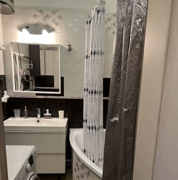 Ванная комната с ванной, раковиной, стиральной машиной, бойлером (на случай отключения горячей воды - в доме своя котельная и отключают крайне редко).