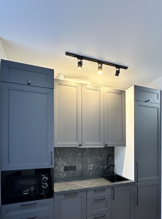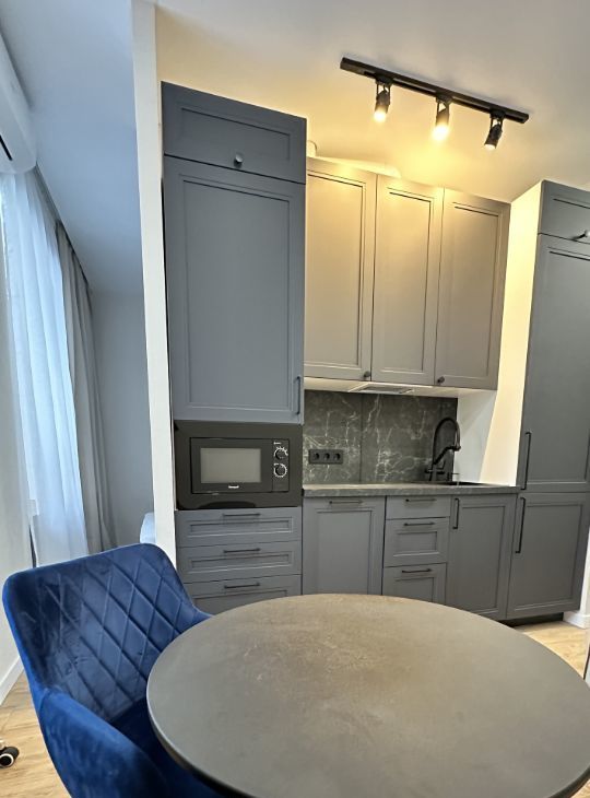 Ортопедический матрац, кровать с подъемным механизмом. Кухня с комплектом техники и установленной фильтрацией питьевой воды и новым фильтром. Встроенный холодильник, микроволновая печь, вытяжка и компактная плита (в ящике),посудомоечная машина. Обеденная группа из стола и двух кресел. Дизайнерское рабочее кресло и место с видом на город, продуманы розетки под столом. Полноценная ванна с тропическим душем, унитаз с гигиеническим душем, стиральная машинка и огромное зеркало с подсветкой. Гардеробная с открытой системой хранения за зеркальными дверьми в прихожей.
