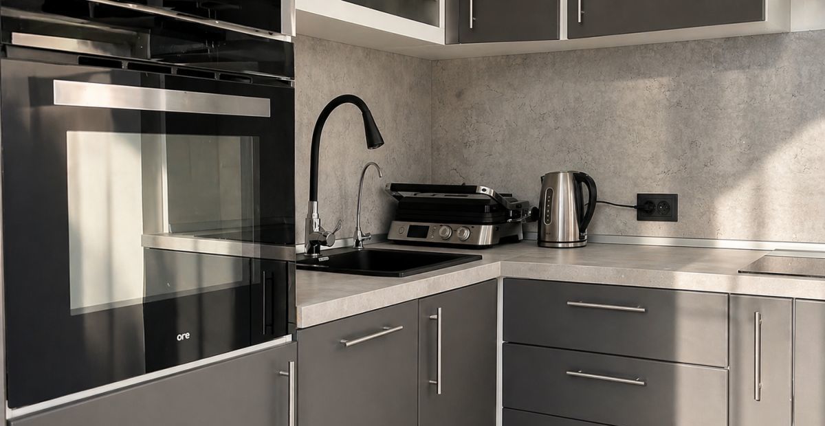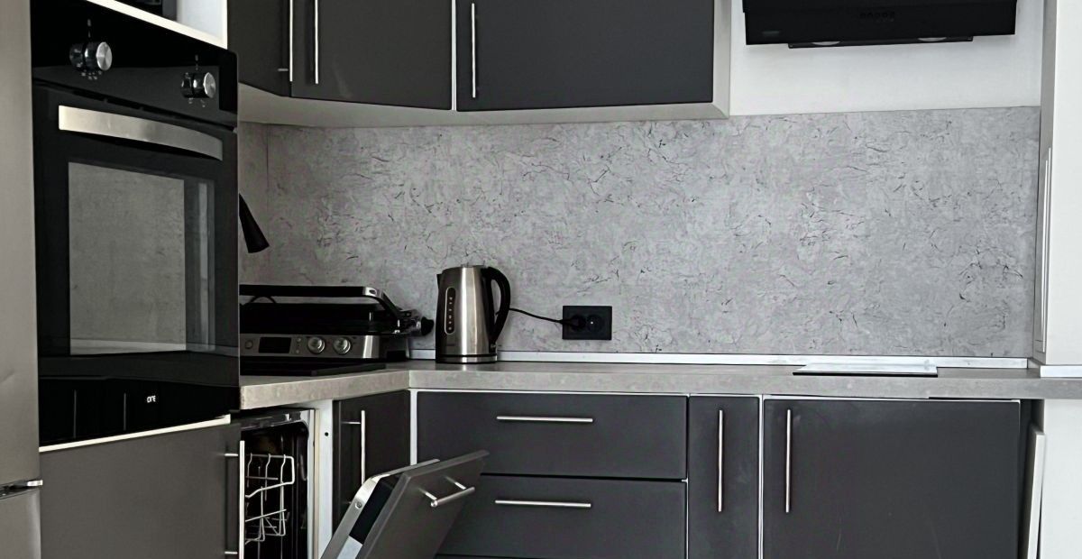 Из техники есть всё, что нужно в повседневной жизни: посудомойка, стиральная машина, духовка, микроволновка, плита, холодильник. Есть кондиционер — важный момент, которого часто нет в подобных квартирах.