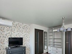 В комнате установлена двухспальная кровать, шкаф, прикроватная тумба. Имеется кондиционер на случай летней жары и бризер (не от застройщика) для круглогодичного пользования. Жк телевизор с подключением к интернету. Торшер.
