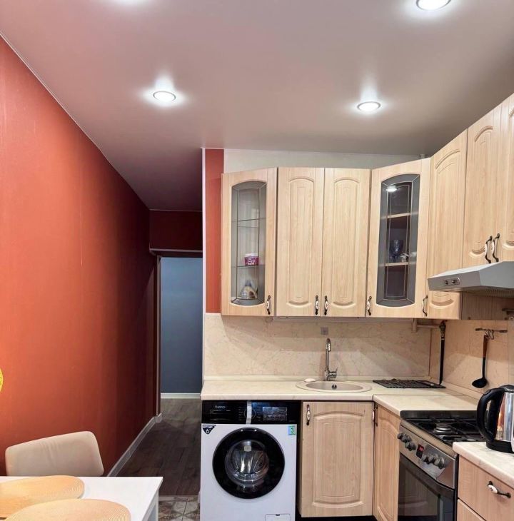 На кухне расположен холодильник, микроволновка и стиральная машина.
