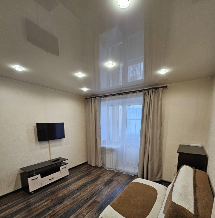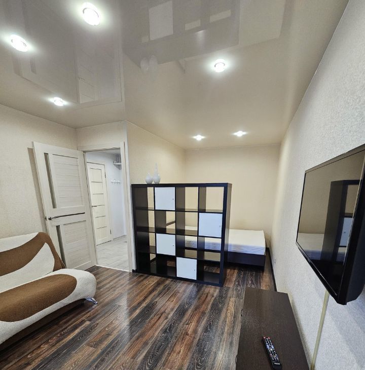 В квартире есть вся необходимая мебель. В комнате двухспальная кровать с матрасом, диван-книжка, телевизор, стеллаж, комод, тумба, утюг.