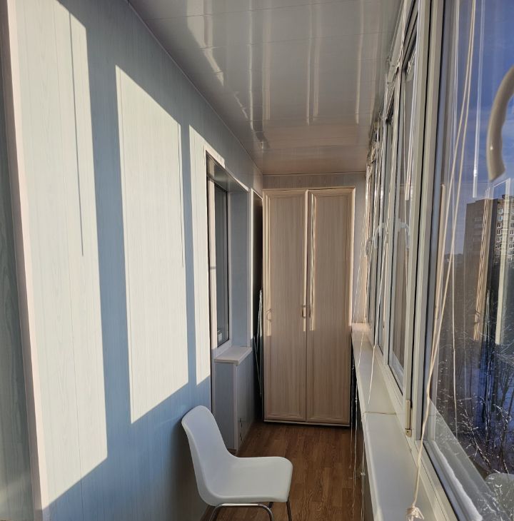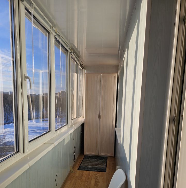 Большая застеклённая лоджия, на которой есть дополнительный шкаф для хранения вещей.