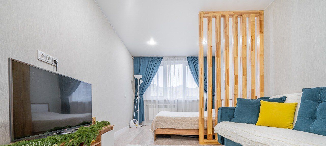 Удобная планировка с большой комнатой, зонированной на спальню и гостиную