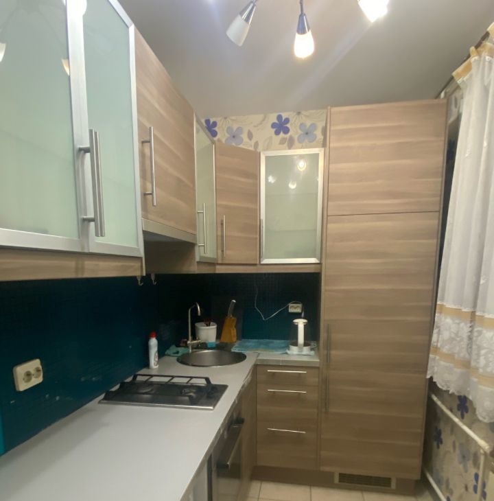 В квартире мебель и техника в хорошем состоянии. Есть Холодильник Bosch, стиральная машина. Встроенная кухня. Имеется плита, духовка, микроволновка. В комнате 2 шкафчика, стенка, комод, кровать.