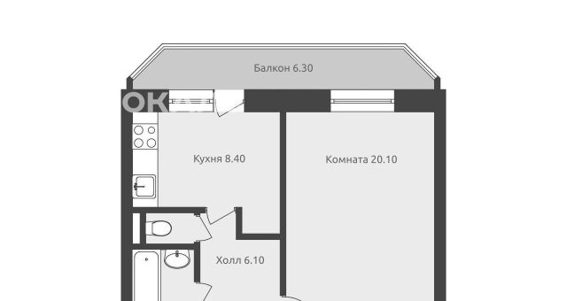 Продаётся квартира с просторной комнатой 20м, кухней 8.4м и большим балконом