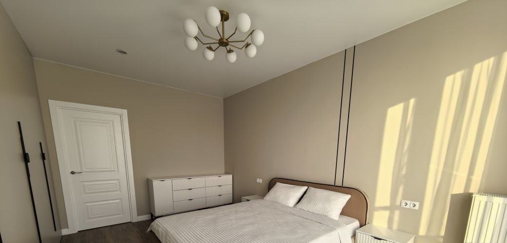 Просторная спальня с большой кроватью и гардеробным шкафом.