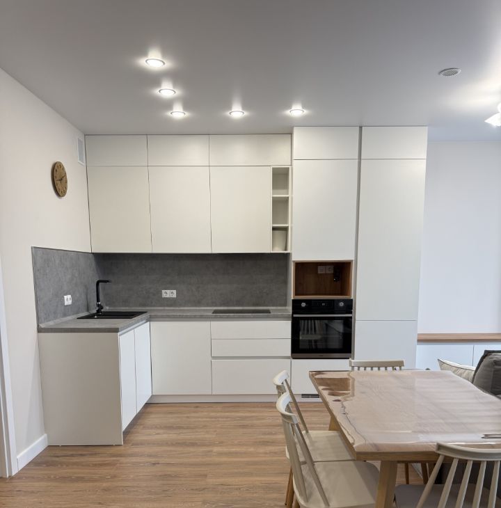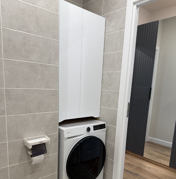 Есть всё необходимое для комфортной жизни (кухонный гарнитур, кровать, шкафы, раскладной диван, холодильник, стиральная машина с сушкой, посудомоечная машина, плита, духовой шкаф).