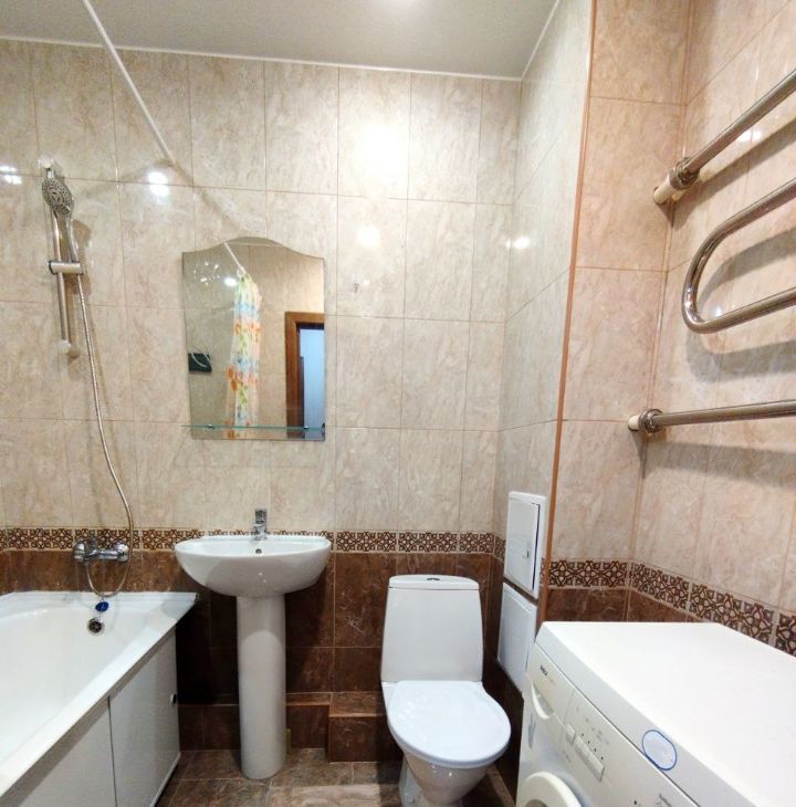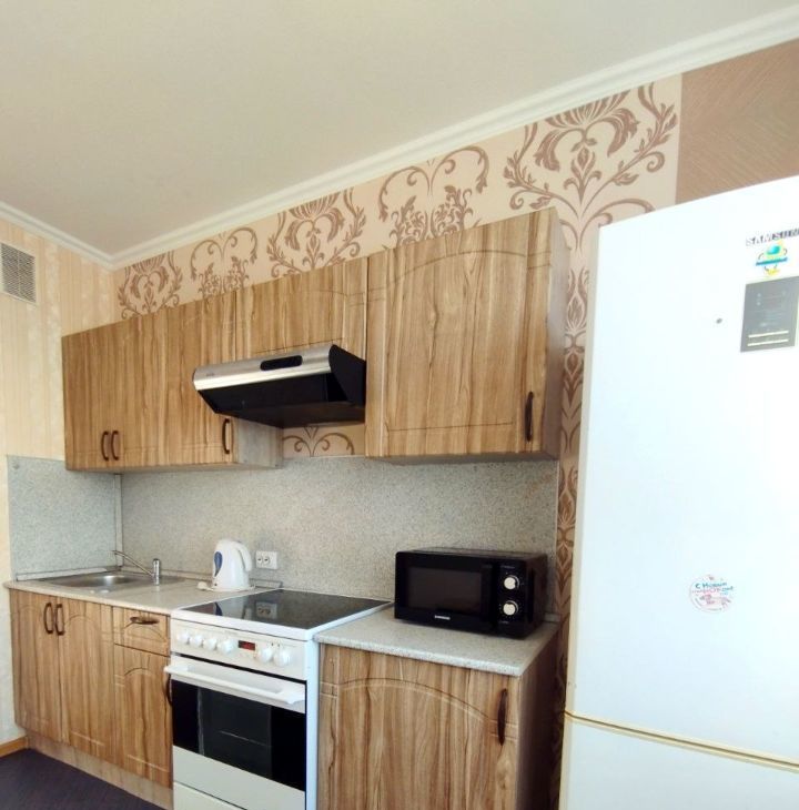 Есть всё необходимое: холодильник, стиральная машина, электрическая плита, вытяжка, кухонный гарнитур, микроволновая печь, двухспальная кровать, шкаф-купе.