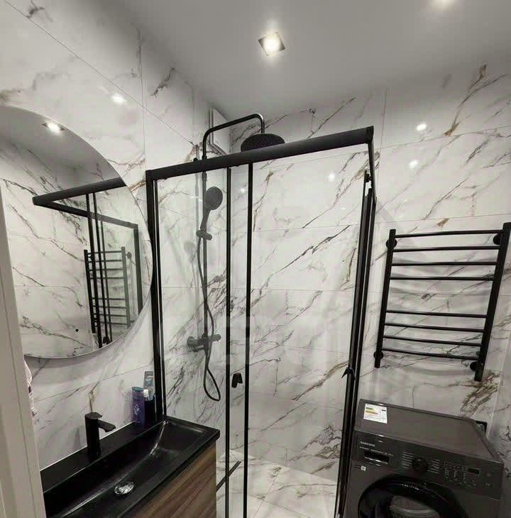 • Раздельный, с душевой кабиной, пеналом для хранения вещей, полотенцесушителем, зеркалом с подсветкой и раковиной с тумбой.