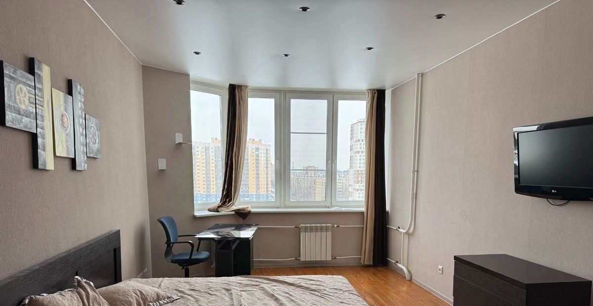 О квартире. Нормальный дизайнерский ремонт. В комнате 2х местная кровать, большая система хранения, телевизор, комод, компьютерный стол и кресло. В кухонной зоне: холодильник, плита, духовка, чайник, столовые приборы и посуда