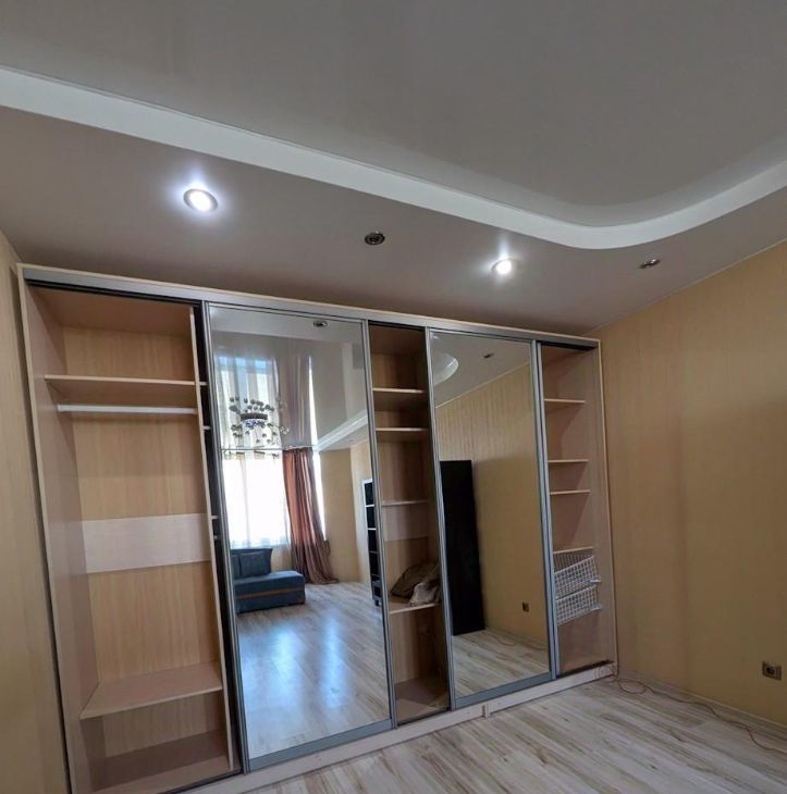 Большой вместительный шкаф-купе, раскладной двухспальный диван(на фото указан как в собранном виде, так и в раздвижном). Горка с телевизором.