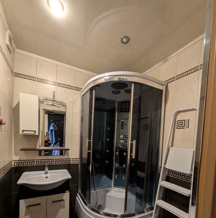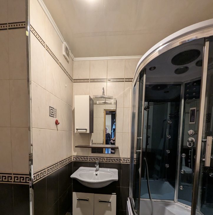Санузел в кафеле, совмещенный, душевая кабина.