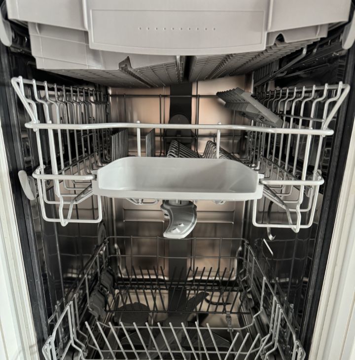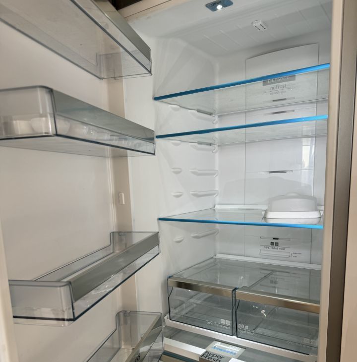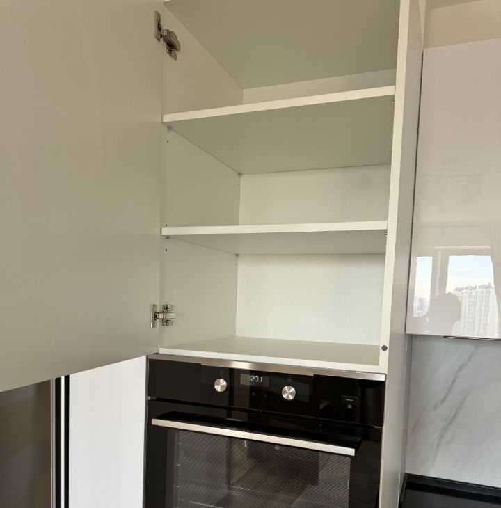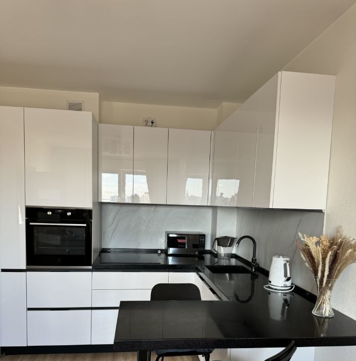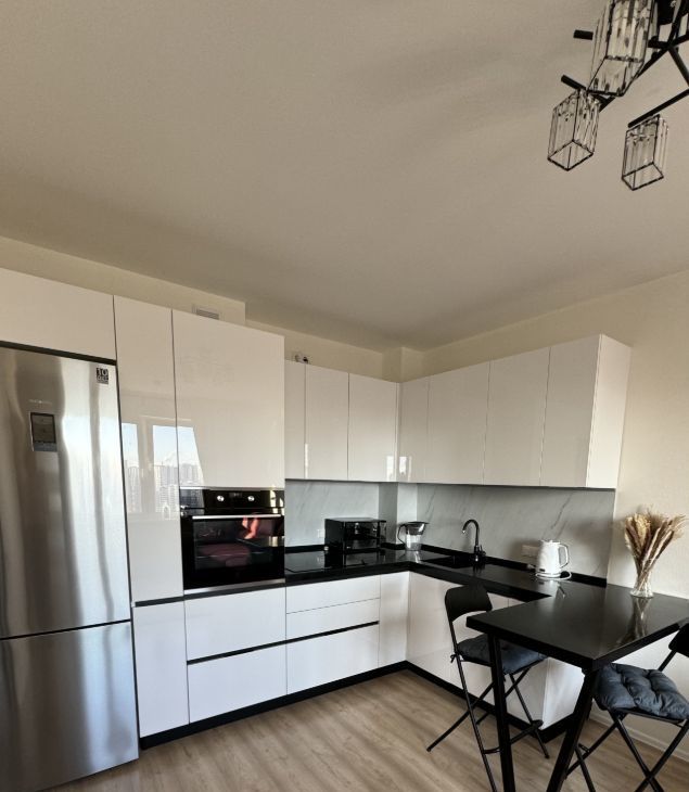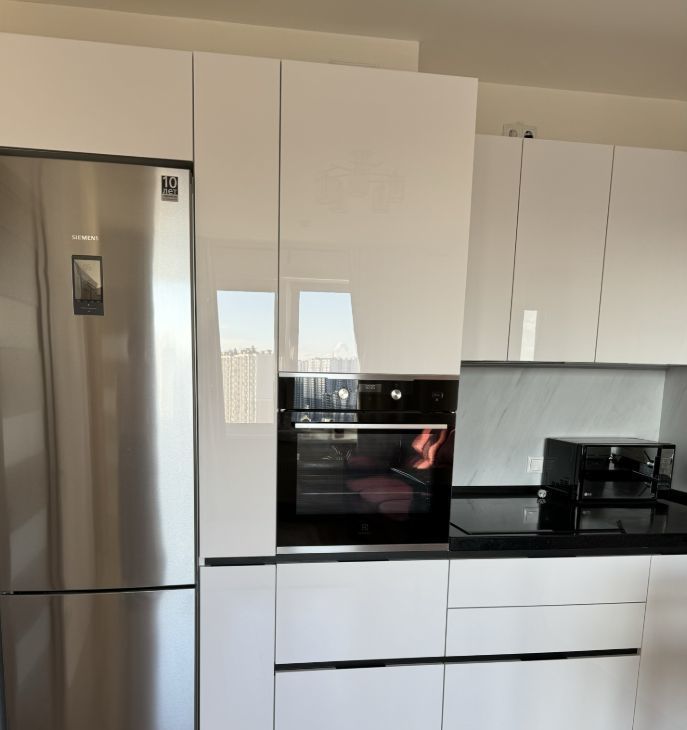 Из техники имеется: индукционная варочная панель Electrolux, встраиваемый духовой шкаф Electrolux, холодильник с морозильной камерой Siemens, микроволновка LG с сенсорной панелью, встраиваемая вытяжка с угольным фильтром, посудомоечная машина Bosh и чайник Tefal. Также имеется вся необходимая посуда.