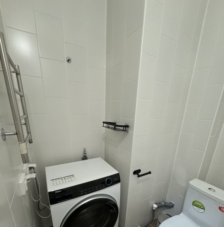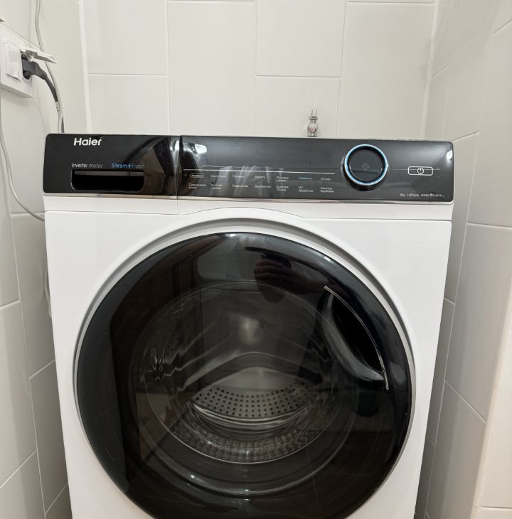 Стиральная машина с сенсорной панелью Haier находится в сан узле.