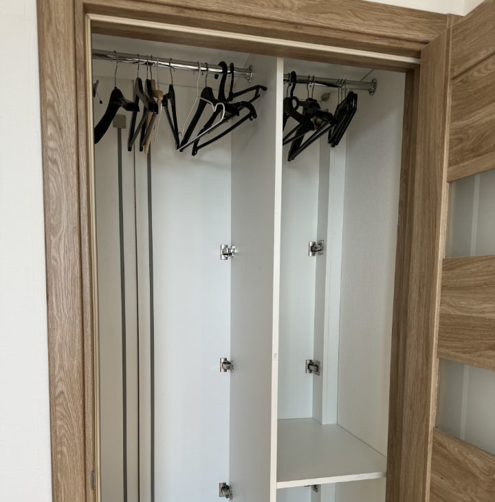 В спальне имеется двухспальная кровать, а также места для хранения одежды. Из техники пылесос Philips и утюг.