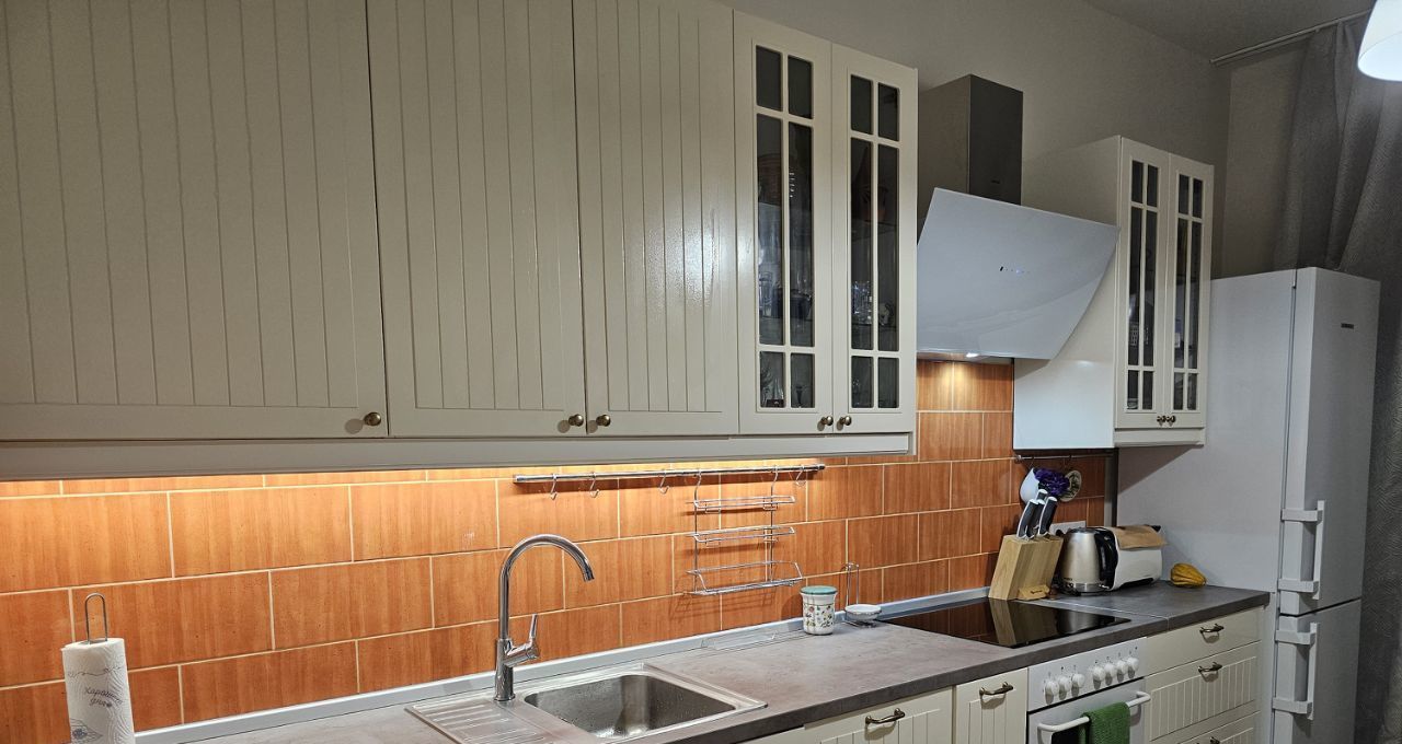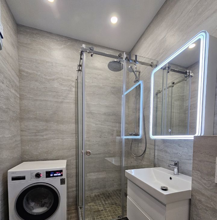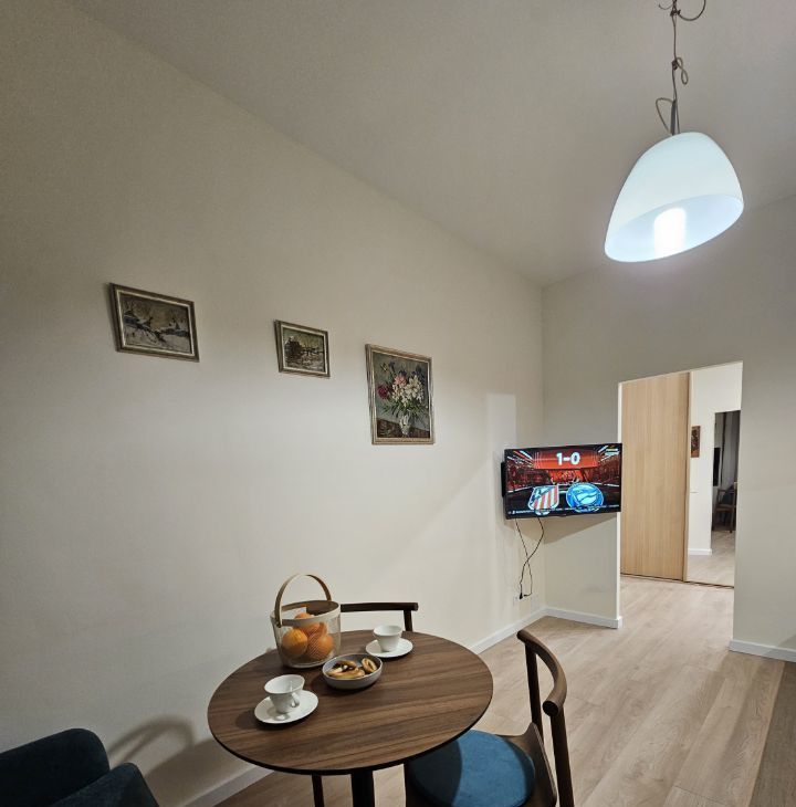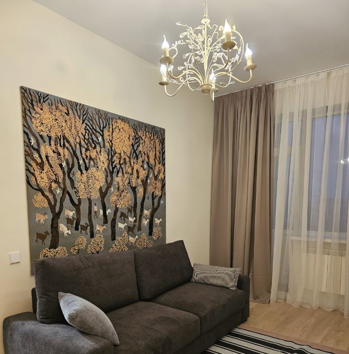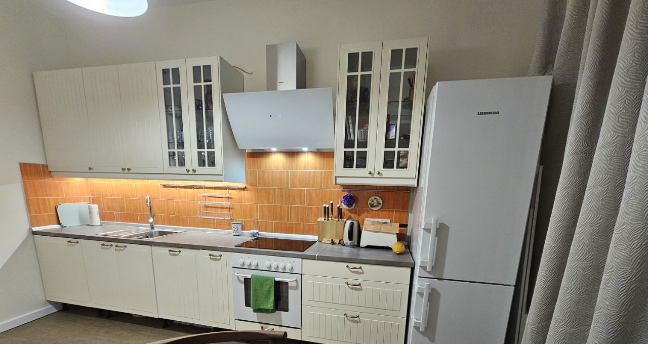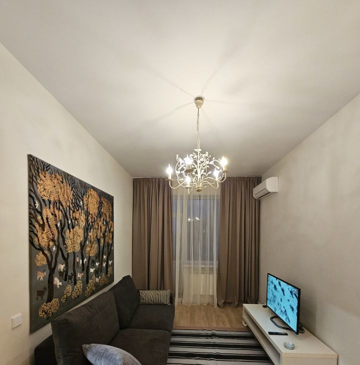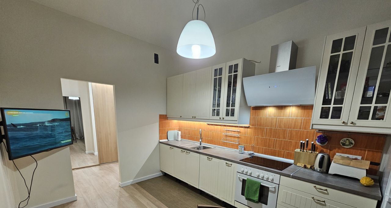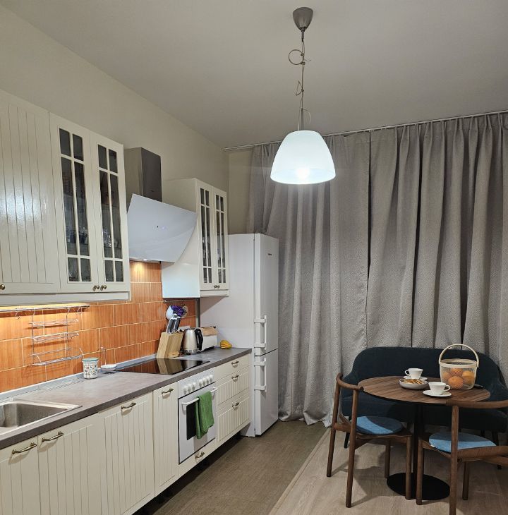 В квартире выполнен дизайнерский ремонт. На кухне площадью 13,4 кв. м есть вся необходимая мебель и современная техника: холодильник, посудомоечная машина, чайник, тостер, духовка, индукционная плита. В комнате вас ждёт кондиционер и телевизор для комфортного отдыха. Санузел совмещённый - душевая кабина, стиральная машина, подвесной унитаз, бойлер. Из окон открывается вид во двор, что обеспечивает тишину и уют. Есть лоджия, где можно наслаждаться свежим воздухом.