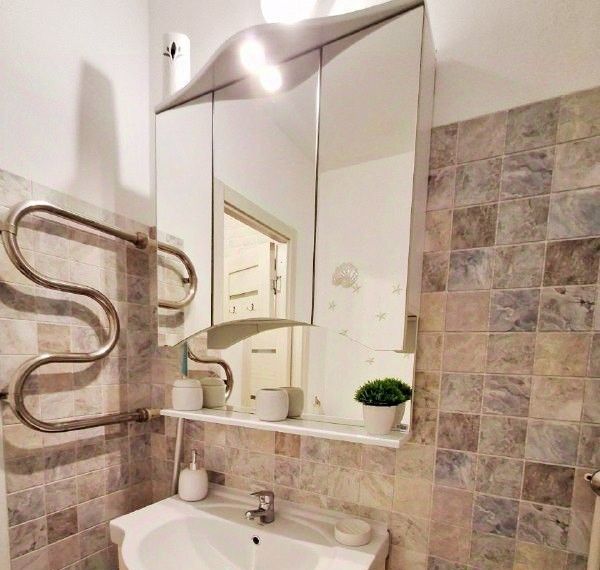 - в ванной комнате: стиральная машинка, зеркальный шкафчик с полкой, тумба с ящиками