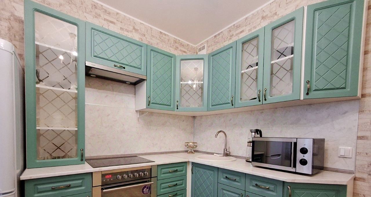 - в кухне: кухонный гарнитур, стол, стулья, холодильник, варочная поверхность, духовка, вытяжка, микроволновка, чайник, кофемолка, посуда и кухонные принадлежности;