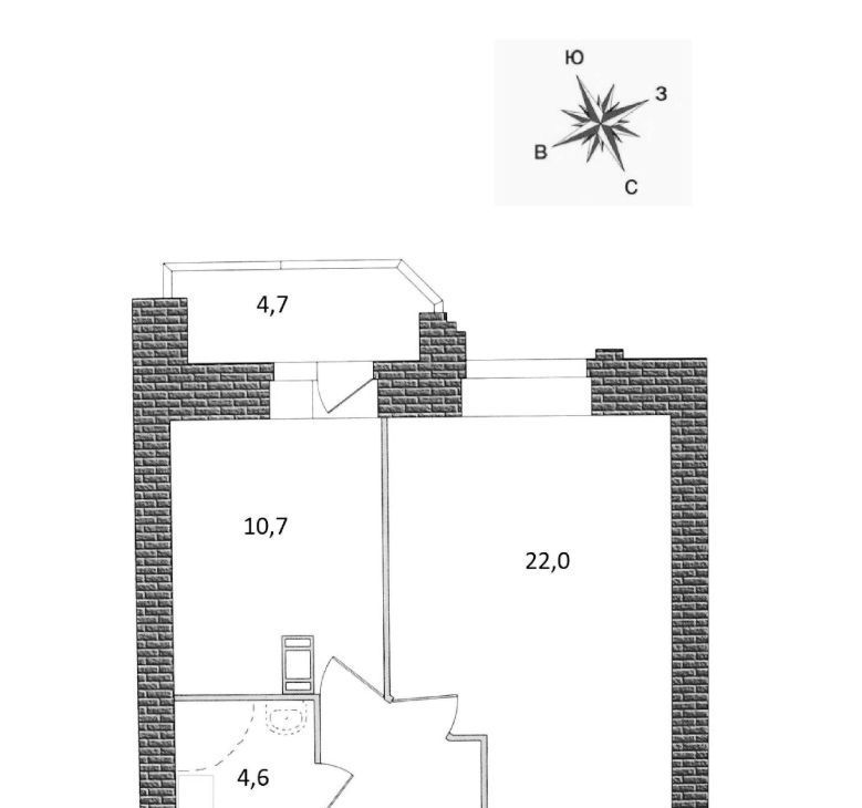 Общая площадь 42,1м (комната 22м2; кухня 10,7м2; совмещённый с/у 4,6м2). Высота потолков 2,72м.