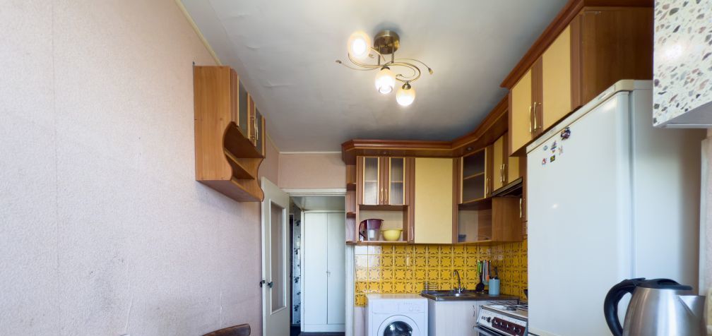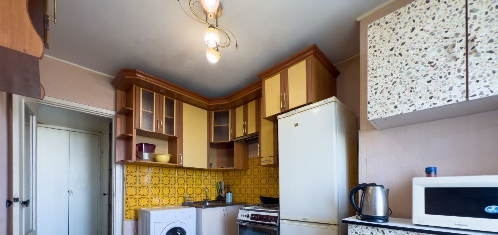 Кухонный гарнитур, стол, стулья, холодильник, стиральная машина, микроволновая печь, чайник.