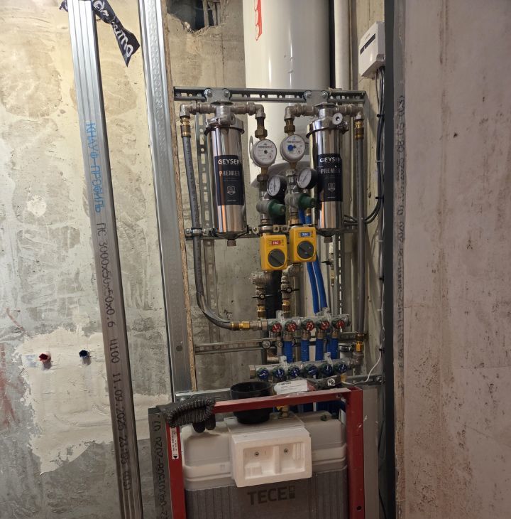 • совмещенного санузла с выводом для подключения стиральной машины, новым накопительным водонагревателем, инсталляцией для подвесного унитаза.