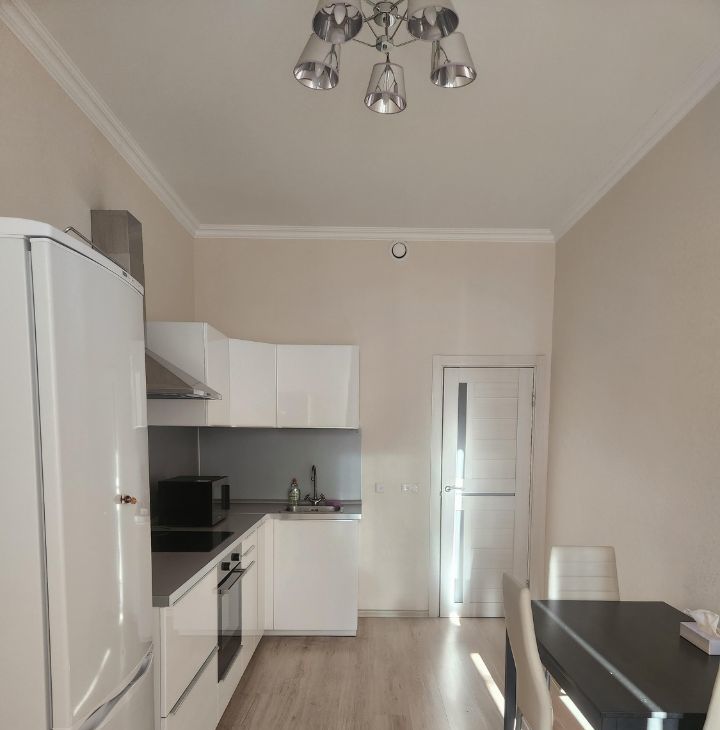 Кухня 16 кв.м. с установленым кухонным гарнитуром Икеа. Из техники холодильник, электрическая варочная панель, духовой шкаф, вытяжка, электрический чайник, микроволновка (новая).