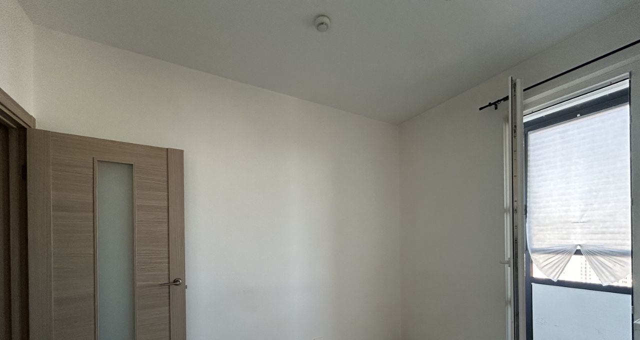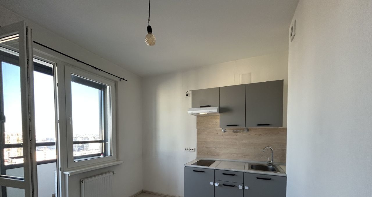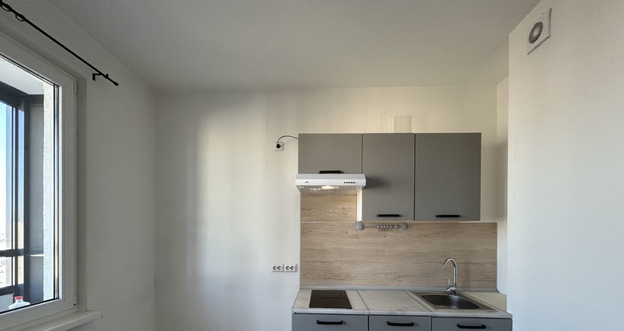 Однокомнатная квартира на 24 этаже 25-этажного дома. Ремонт в светлых тонах. Просторная комната, без мебели. Кухня с выходом на балкон. Есть кухонная мебель с раковиной. плитой и вытяжкой. Без животных.