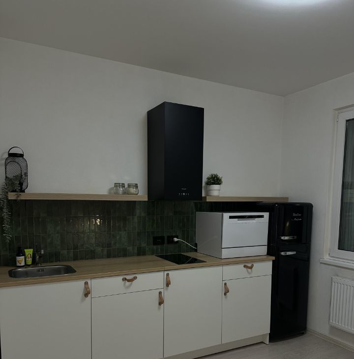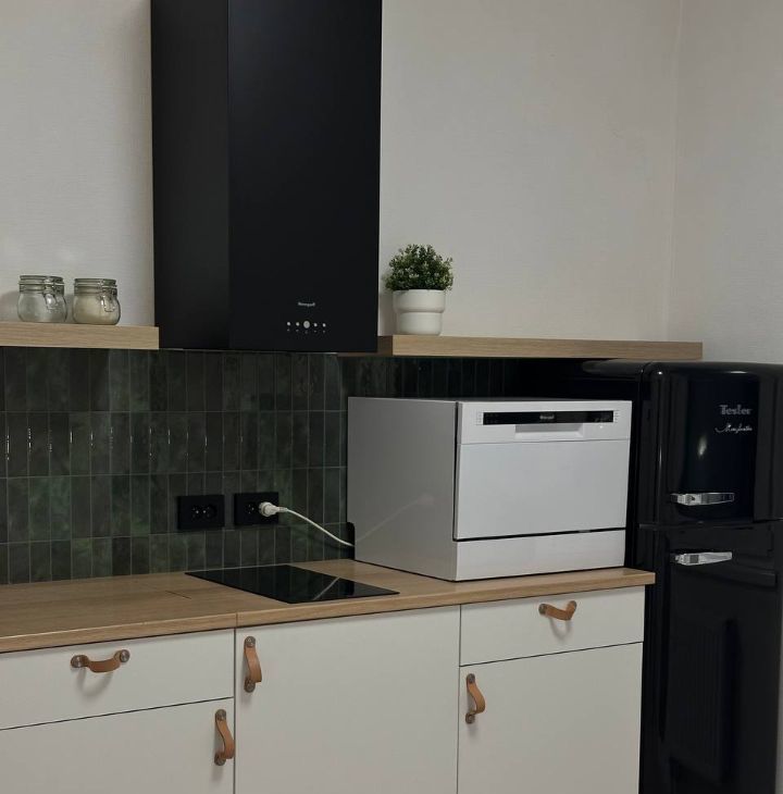 -Кухня с посудомоечной машиной, двухконфорочной плитой, холодильником и вытяжкой