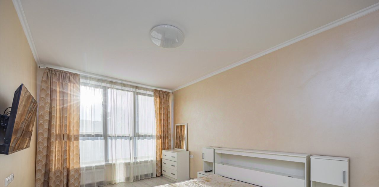Удобная планировка разделяет спальную и кухонную зоны, превращая студию в 1к квартиру.