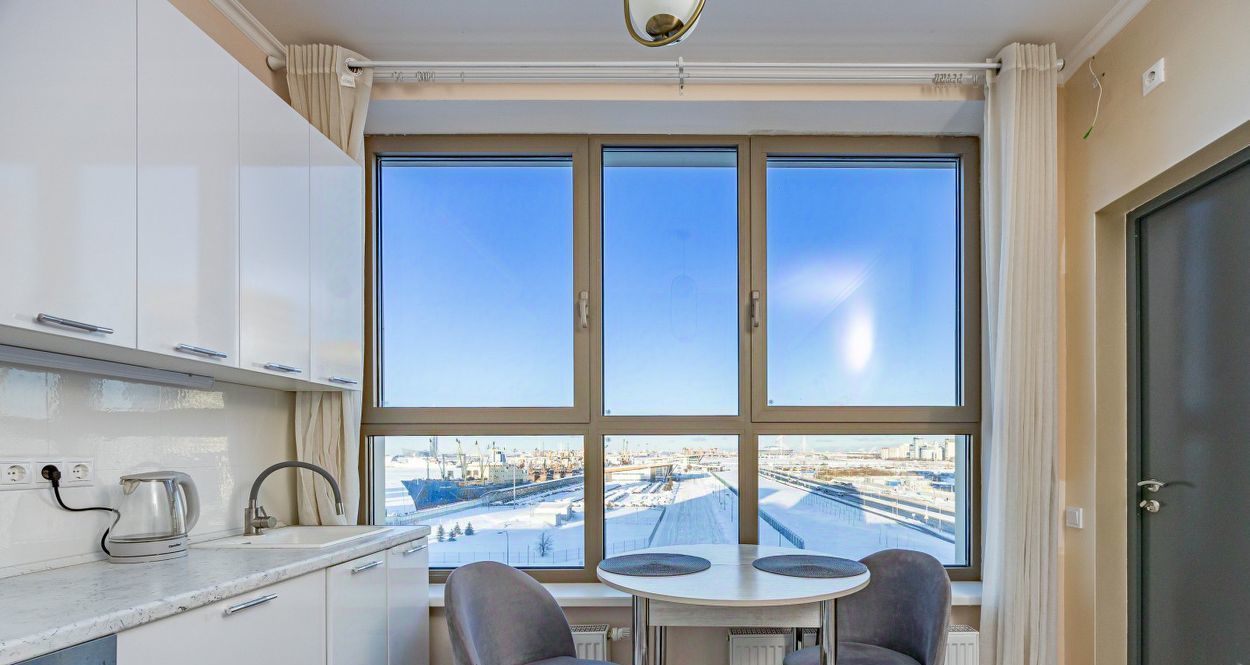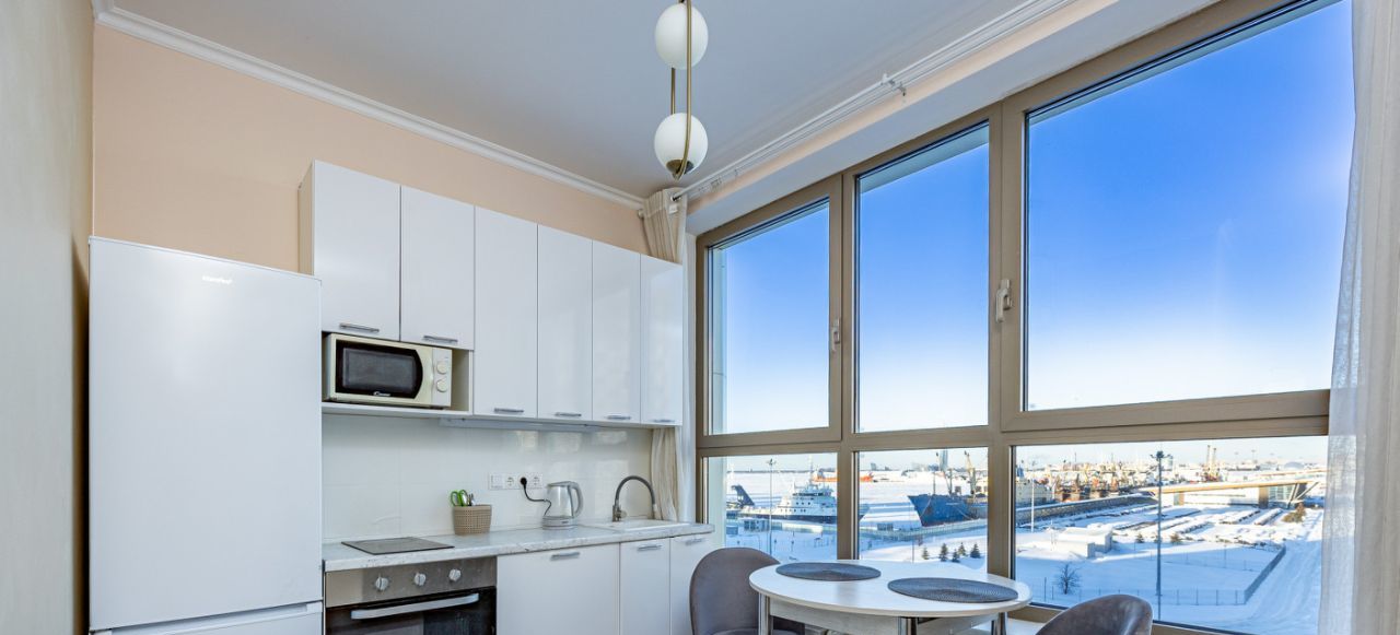 Мебель и бытовая техника в отличном состоянии. Панорамные окна со зрелищным видом на Морской вокзал, Лахту, стадион "Зенит".