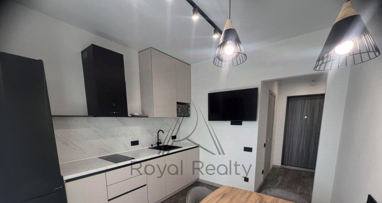 Просторная кухня-гостиная: Современный гарнитур со всей встроенной техникой (посудомойка, индукция, холодильник) и зона отдыха с ТВ.