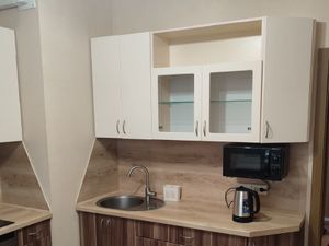 Установлен водогрей, фильтры для воды. Есть напольный кондиционер. Много мест для хранения - в прихожей угловой шкаф, и 2 шкафа в жилой комнате; также можно оборудовать рабочее место.