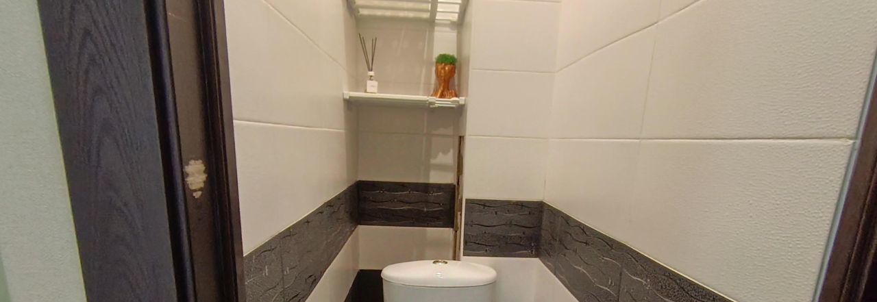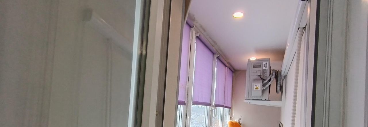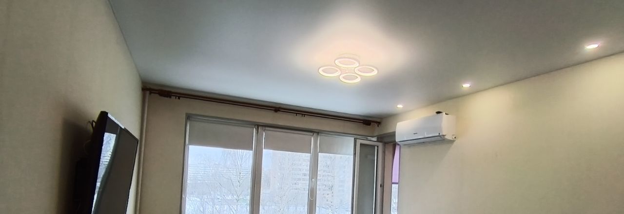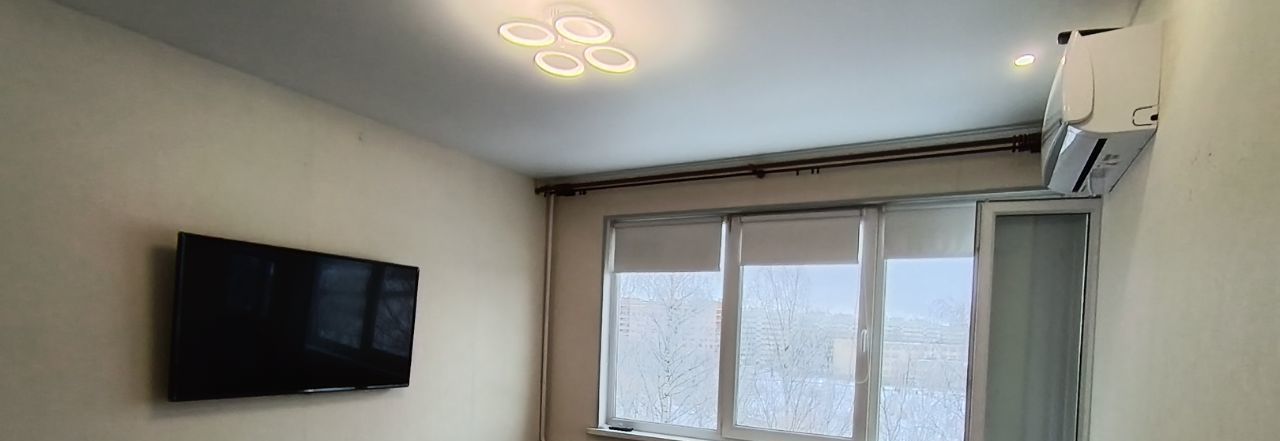 Комната просторная и свободная, из мебели только телевизор и кондиционер. Кухня аккуратная, с гарнитуром, всё необходимое есть. Отдельного внимания заслуживает большая гардеробная — вещи не будут занимать лишнее место. Лоджия светлая, приятное дополнение к общему пространству. Санузел раздельный, стиральная машина стоит там.