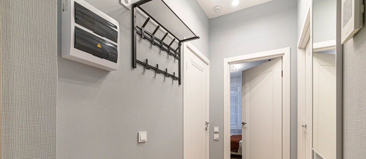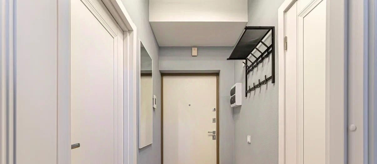 Прихожая оснащена настенной вешалкой, дизайнерским пуфом и зеркалом