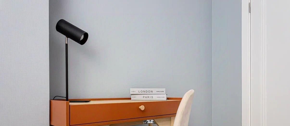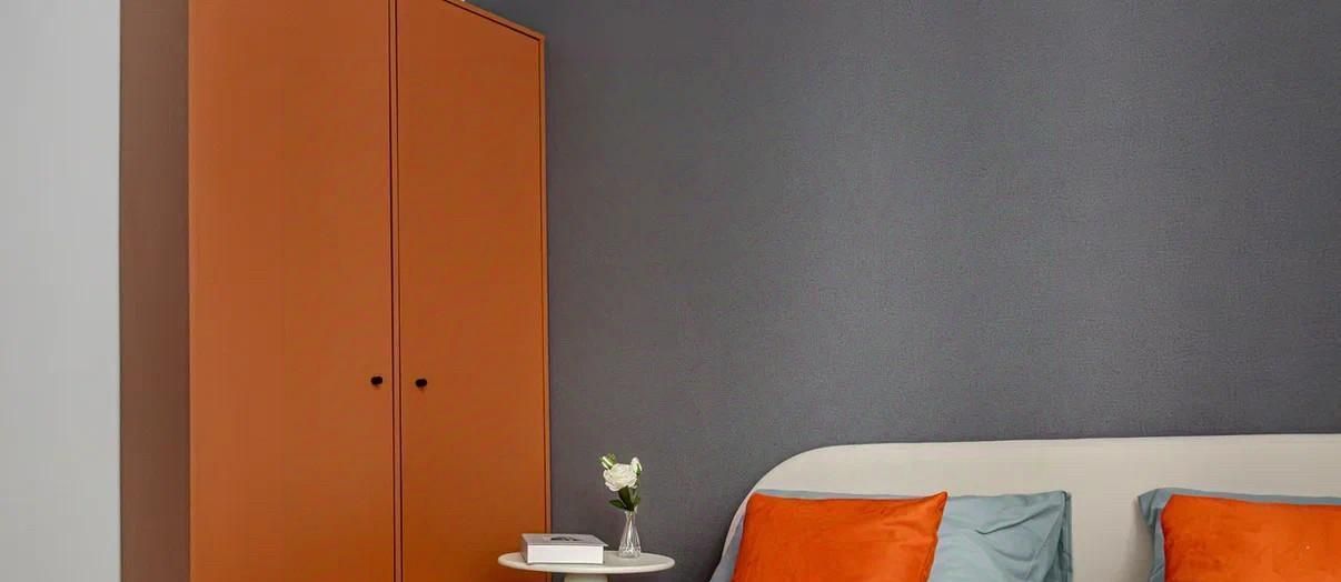 Уютная комната с двуспальной кроватью, рабочей зоной и шкафом.